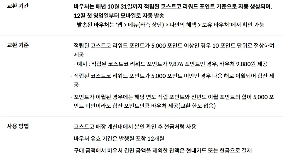 이용 금액에 따라 코스트코 전용 포인트로 적립이되며, 적립된 포인트는 바우처로 교환되어 크스트코 매장에서 현금처럼 사용할 수 있게됩니다