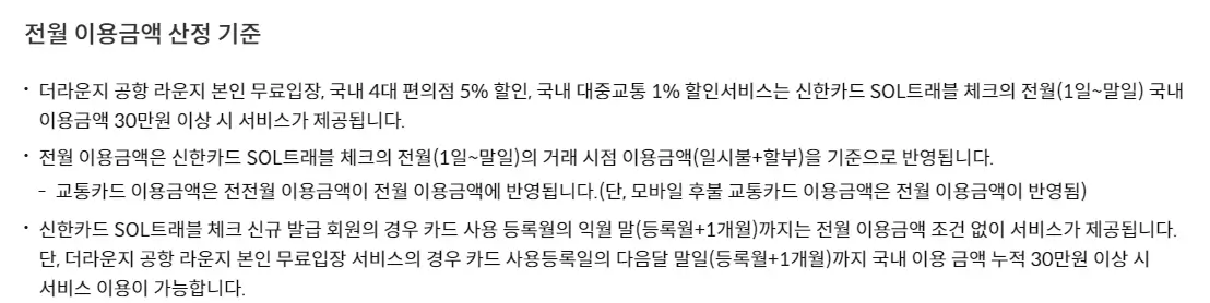 신한SOL트래블 체크카드를 신규 발급받았을 경우, 사용 등록월의 익월 말까지는 전월 이용 금액 조건 없이 혜택 서비스를 제공받을 수 있습니다.단, 더라운지 공항 라운지 무료입장 서비스는 카드 사용등록일의 다음 달 말일까지 국내 이용 금액 누적 30만 원을 달설해야만 혜택을 받을 수 있습니다.