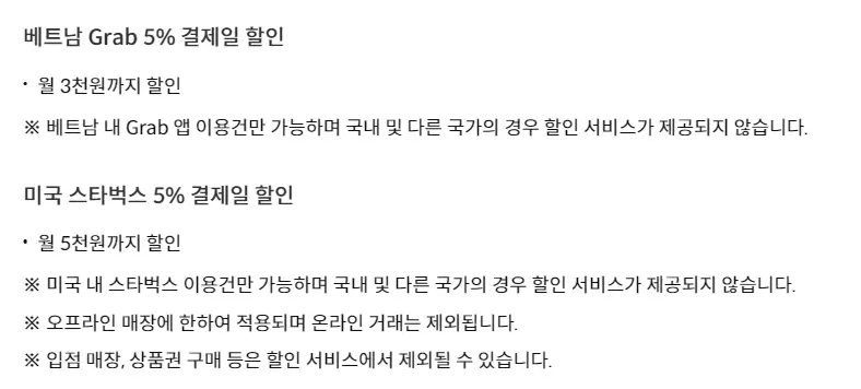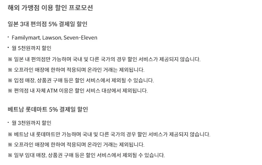 - 해외 대중교통 컨택리스 방식으로 이용 시 1% 결제일 할인 혜택