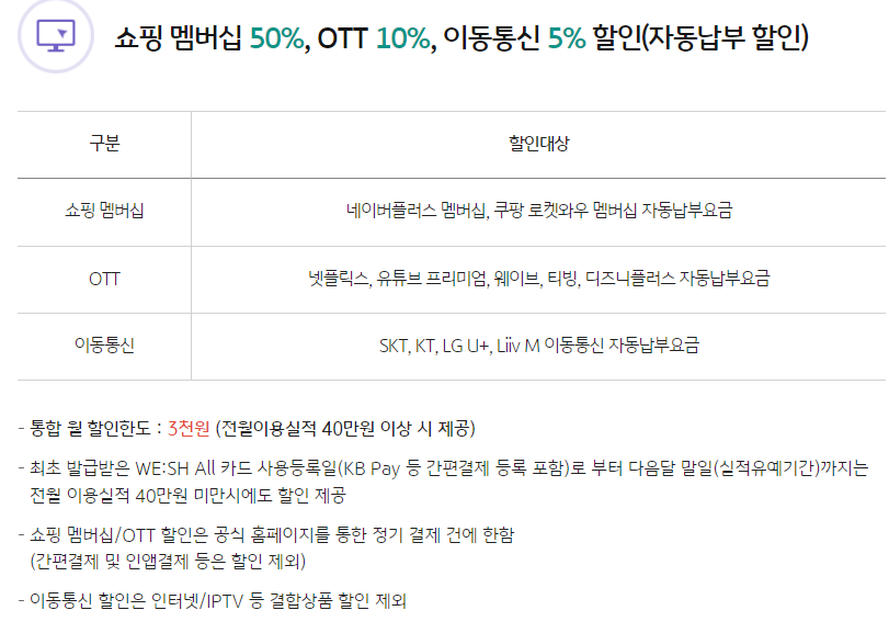- 쇼핑 멤버십 : 50% 할인 / OTT : 10% 할인 / 이동통신 : 5% 할인